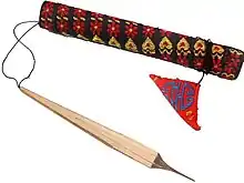Derived from the mouth harp of the Hmong people,[1] Đàn môi ((in Vietnamese): Đàn môi, "lip lute") is the Vietnamese name of a traditional musical instrument widely used in minority ethnic groups in Vietnam (including the Jrai "Rang Leh"[2]). An inward orientated ("the lamella points inwards towards the mouth"[3]) idioglot (noncomposite: "the tongue and frame are of the same piece of material"[4]), mouth harp somewhat similar to the metal heteroglot/compound jaw harp, the dan moi, rather than being held against the teeth while being played, like a jaw harp, is held against the lips while being played.