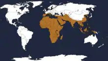 The plain tiger is found across the entirety of Africa, where the predominant subspecies is D. c. alcippus. Its range extends across the majority of Asia throughout Indian subcontinent,[1] as well as many south Pacific islands. The plain tiger is even present in parts of Australia.[3] D. c. chrysippus is most common throughout Asia and in some select regions in Africa, while D. c. orientis is present in more tropical African regions as well as some African islands, including Madagascar and the Seychelles.[5][2] It is also found in Southern Europe and Kuwait. These insects are considered bioinvaders in North America.