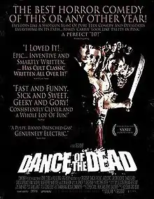 Jason Whyte of eFilmCritic.com called it a "triumph in nearly every way; not only is an independent film that takes its small budget and runs with it, it is everything you want out of a horror comedy and more."[21] Scott Weinberg of FEARnet was surprised that "character development" was possible, and called it "fast and funny, sick and sweet, nerdy and gory. Basically, a whole lot of fun."[22] Expecting a "cheesy zombie flick", reviewer Brian Gibson instead described it as a "zombie/prom weekend film that ended up being one of the best surprises of the [film] festival."[23] Anton Bitel, who writes for UK film magazine Little White Lies, was tired of the zombie comedy genre in general yet still saw a film distinguished by "sharp writing, amusing characters, and a real affection for nerd culture."[24] Collin Armstrong of Twitch Film wrote, "Owing a sizable debt to Dan O'Bannon's classic punk gut-muncher Return of the Living Dead, Dance manages to offer a few new ideas while mostly just taking those we've seen time and again to gonzo levels of execution."[25] Steve Barton of Dread Central rated it five out of five stars and wrote that the film "is rife with everything we could want in a living dead flick — great characters, good-looking zombies, and tons of gore!"[26] Tim Anderson of Bloody Disgusting rated it five out of five stars and called it "the best horror comedy of this or any other year".[27] David Harley, also writing at Bloody Disgusting, rated it four-and-a-half stars out of five and wrote, "Out of all the films I’ve seen at SXSW this year, regardless of genre, Dance of the Dead stands out as the most impressive and entertaining."[28]