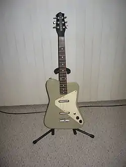 The Danelectro Dano Pro is an electric guitar made by Danelectro in 1963 and 1964,[1] reissued in 2007 and again in 2012. The original was a 3/4 scale guitar with a single lipstick tube pickup, made by putting the pickup in surplus lipstick tubes purchased from a cosmetics supplier.[2] The reissue features two lipstick pickups.The pickups are wired in series rather than in parallel as is common with most electric guitars. Because of this, the guitar is louder when the toggle is set to both the neck and bridge pickups rather than when only one pickup is selected.[3] The guitar body is hollow, made of masonite and plywood with a maple neck and rosewood fingerboard. The body's vaguely trapezoidal shape has led to it being described as a bowtie or Flintstone guitar.[1] The original had a short scale neck with a non-adjustable bridge. The reissue has a fully adjustable bridge and a full scale neck of 19 frets with the neck connecting to the body at the 14th fret. Because of this, playing the higher frets is nearly impossible. Its light tone and slight twang makes it very suitable for playing jangle pop, surf, country and blues.[2][4] Guitarist Magazine said of the 2007 reissue "if it's Jack White or Jon Spencer dirty fuzzbox blues you are after, it's here in spades, alongside with Beatles-in-Hamburg rock 'n' raunch, garage punk venom and 1980s indie jangle." [5]