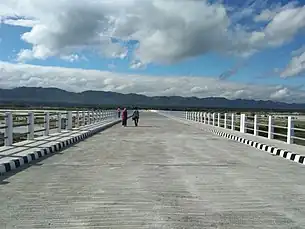 The Dudhwas rise steeply to a crest at about 700 meters, then slope more gradually into the Deukhuri Valley, down to 250 meters elevation at the Rapti River. The Dudhwas extend more than 100 km, causing the Rapti to detour west around them before turning southeast down the main trend of the plains into India. Deukhuri's climate is nearly tropical and it is well watered by the river, as well as possessing abundant groundwater. North of Deukhuri Valley, the Dang Range rises as high as 1,000 meters with passes at about 700 meters. The Dang Valley lies north of these hills, drained by the Babai River tributary to the Ghaghara (Karnali). Valley elevations range from 600 meters along the Babai with alluvial slopes gradually rising northward to 700 meters along the base of the Mahabharat Range. The district then extends upslope to the crest of the Mahabharats at 1,500 to 1,700 meters elevation. The bordering districts to the north are Pyuthan, Rolpa, and Salyan. The Rapti River of Western Nepal traverses through most of the lower Dang valley. It flows beneath the Churia range first on the northern side of the hills and then leaves the hills on the southern side.[17] Nepal's second-longest bridge over Rapti river in Dang district connects Sisahaniya of Rapti Rural Municipality with Mahadeva of Gadawa Rural Municipality in the district.[18]