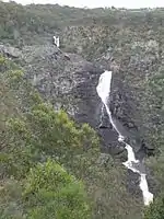 The Apsley Falls are located 20 kilometres (12 mi) east of Walcha, 1 kilometre (0.62 mi) off the Oxley Highway. Here the Northern Tablelands plateau drops precipitously into the rugged gorges carved out by the Aspley and upper Macleay Rivers which meander through the park. There is a 52-metre (171 ft) steel stairway leading to an observation deck (with disabled access) where there are great views of the deep gorge and the falls. There are two large falls, with two walking tracks taking in the Gorge Rim Walk and the Oxley Walk, picnic facilities and camping area for overnight stays. On 28 December 2009 the steel footbridge leading to Gorge Rim Walk was washed away.[12]