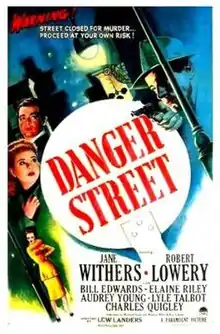 Danger Street is a 1947 American mystery film directed by Lew Landers and written by Winston Miller, Kae Salkow and Maxwell Shane. The film stars Jane Withers, Robert Lowery, Bill Edwards, Elaine Riley, Audrey Young and Lyle Talbot. It was released on June 20, 1947 by Paramount Pictures.[1][2]