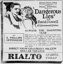 Dangerous Lies is a 1921 British silent drama film directed by Paul Powell. Alfred Hitchcock is credited as a title designer.[1] The film is now lost.[1]