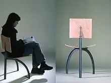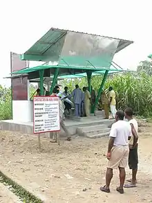 In 2003 she produces the Kiosque à eau (water kiosk) in Douala's neighborhood Bessengue, commissioned by doual'art. This small building is conceived as a public fountain where people can buy both water and food. Its canopy in particular, goes back to Jesus Palomino's construction, realized within the Bessengue City workshop, organized by Goddy Leye and ArtBakery art center.[3]