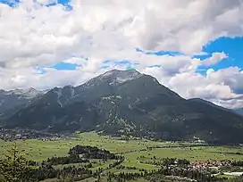 The Daniel (2,340 m) is a mountain in the Austrian state of Tyrol, and the highest peak in the Ammergau Alps, a range within the Northern Limestone Alps . Located near the villages of Ehrwald and Lermoos, it is a popular mountain with hikers. Its North Face is around 200 metres high and its South Face has a more schrofen-like character. With the almost equally high Upsspitze (2,332 m) it forms a double summit. To the northwest is a neighbouring peak, the Hochschrutte (2,247 m).