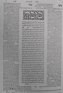 The Bomberg edition of the Talmud established the standard both in terms of page layout as well as pagination (with the exception of the tractate Berachot which follows Bomberg's second edition).[15] Prior to the printing of the Talmud, manuscripts had no standard page division, and the Talmud text usually did not appear on the same page as the commentaries, which were contained in separate codices.[19] The standard page layout in use in all conventional editions of Talmud today (also the accepted method of citing a Talmudic reference) follows the pagination of Bomberg's 1523 publication.