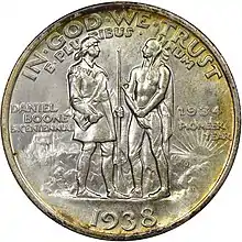 The Daniel Boone Bicentennial half dollar was designed by Henry Augustus Lukeman and minted in 1934, commemorating the 200th birthday of frontiersman Daniel Boone.[1] The obverse depicts Boone while the reverse depicts a frontiersman (Boone) standing next to an Indian Chief (Shawnee Chief Black Fish) in front of a stockade on the left and the rising Sun on the right.[2]