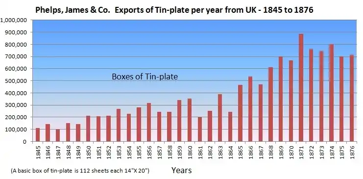 Phelps, James & Co. dominated the export of tinplate from the UK. In America the imported tinplate was used for manufacturing such things as roofing, tools, machinery, cans, cutlery, skillets, pots, pans, pitchers, plates, washing boards, bathtubs, etc.[21]