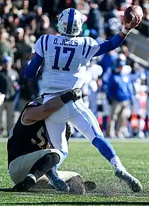 In 2017, he completed 230 of 413 passes (55.7%) for 2,439 yards, 14 touchdowns and 11 interceptions as a junior.[10] Jones was named MVP of the 2017 Quick Lane Bowl against Northern Illinois where he went 27-of-40 with 252 passing yards and two touchdowns, along with 86 rushing yards from sixteen carries for one touchdown.[11]
