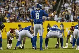 Despite a stellar preseason, Jones was named the backup behind Eli Manning.[18] Jones played his first regular season game on September 8, 2019, against the Dallas Cowboys in relief of Manning, where he completed 3-of-4 passes for 17 yards and lost a fumble as the Giants lost 35–17.[19] On September 17, 2019, Jones was named the starter over Manning for the Week 3 matchup against the Tampa Bay Buccaneers.[20] In his first start, Jones completed 23 out of 36 passes for 336 yards with a 112.7 passer rating and two passing touchdowns along with 28 rushing yards and two rushing touchdowns in a 32–31 comeback win against the Buccaneers despite losing two fumbles.[21] He became the first Giants' rookie quarterback to win his first career start since Scott Brunner in 1980. Jones led the Giants back from an 18-point deficit to beat the Buccaneers and became the seventh rookie quarterback in NFL history since 2010 to have a game-winning drive in their first career start.[22][23] He was also named NFC Offensive Player of the Week for his performance in Week 3.[24]