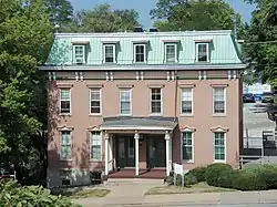The Daniel T. Newcome Double House is a three-story Second Empire structure designed by T.W. McClelland. It is the only recorded double house in Davenport built in that style.[3] The building is brick construction and features bracketed eaves and a mansard roof in metal, which is somewhat unusual in the city.[3] A frieze is created below the eaves with a single strip of molding. The entryways on both sides of the house are in the center of the structure. The six-second floor windows are equally spaced across the front. The paired entrances and the even number of bays is typical of Davenport's double houses.[3] The third floor features five windows. All of the windows are topped with decorative hoods. A small porch covers the double entry. The house presents a symmetrical appearance.