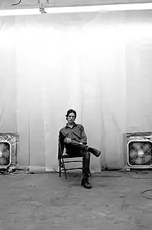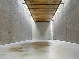 Daniel Turner studied painting and printmaking at Norfolk State University and received a B.F.A. from San Francisco Art Institute.[1] Turner worked in construction and demolition before being employed as a security guard at The New Museum in New York City.[2] He was hospitalized several times for psychosis resulting in an action titled, Burning an Entire Body of Work (2006)[3][4] in which he burned all previous paintings to date.[5] Turner now works primarily in sculpture often involving the creation or transformation of materials, objects and environments into architectural or ephemeral forms. His sculptures are often characterized by a specific response to site[6] under a controlled set of processes. This approach has enabled Turner to base form on transposition, preserving a sensory link to geographical locations, cultural associations and human contact. These elements are present in works where an entire waiting room is cast into a series of solid bars,[7] a former psychiatric facility burnished to a darkened stain against a wall,[8] or a cafeteria dissolved[9] across the expanse of a floor.[10] In 2019, Turner extracted one metric ton of hospital beds from The Vinnitsa Regional Psychoneurological Hospital in Vinnitsa Ukraine which were archived, melted and recast into two solid forms.. For his solo exhibition at Kunsthalle Basel (2022), the artist extracted elements from three sites in the Basel region that triangulate between architecture, the pharmaceutical industry, and psychology.[11] These materials included several tons of heating radiators and oil tanks which the artist removed from the interiors of the chemical plant BASF, the pharmaceutical labs of Novartis, and former psychiatric facility Holdenweild.[12] Material excavated from each of the three sites were melted into minimal forms and burnished into the surface of large scale works on canvas.[13] [14][15]