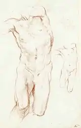 The statue of Daniel was placed in the niche to left of the entrance. On 26 June 1657 Bernini received 1000 scudi for the figure of Daniel which was then already in its place.[1] The surviving preparatory drawings (four studies in the Museum der bildenden Künste in Leipzig) prove that the inspiration for the statue was provided by the famous Laocoön group.[2] The drawings show the creative process through which the classical models were studied and reinvented by the Baroque artist. A preparatory terracotta model for the statue also survived in the Vatican Museums. Formerly thought to be the work of an assistant, after its cleaning in the 1980s it has been mainly attributed to Bernini himself, and even bears his fingerprints.[3]