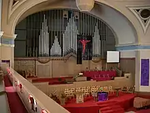 The elaborate cornice of the sanctuary was removed in 1990. This removal of the cornice still affects the appearance of the building today.[2]