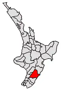 The Tararua District is a district near the south-east corner of New Zealand's North Island that is administered by the Tararua District Council. It has a population of 19,050 (June 2022),[4] and an area of 4,364.65 km². The Tararua District Council was created by the amalgamation of the Dannevirke Borough, Eketahuna County Council, Pahiatua Borough Council, Pahiatua County Council and Woodville District Council in the 1989 local government reforms.[5]