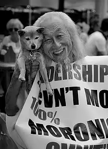 In 2015, Lim was fined $500 for offensive conduct after publicly wearing a sign which labelled the then Prime Minister of Australia Tony Abbott a 'Cunt'.[8] A GoFundMe campaign by supporters raised enough money to cover the fine within less than an hour.[9] The court ruled that the word 'cunt' is not always offensive when said in public compared to countries like the United States and that the fine would have constricted his right to political communication implied in the Constitution.[10] Due to this ruling, he was not fined. The case was seen by law professor Luke McNamara as a step towards protecting civil liberties.[11]