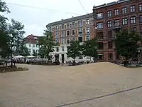 The square was redesigned by COBE and GHB Landskabsarkitekter in 2011. Its floor is paved with slender, yellow tiles and rises in four waves with perforated rusty red iron sides. The vegetation consists of Robinia trees and geometrically shaped flower beds.[1]