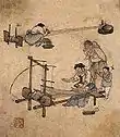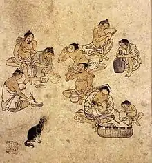 Danwon pungsokdo cheop is an album of genre painting (pungsokhwa or pungsokdo) drawn by Kim Hongdo during the late Joseon dynasty. It was named after Kim's pen name, Danwon and comprises the 25 paintings in total. The album is painted with light watercolor on hanji (한지 Korean paper). Each painting depicts vividly common people's daily life in the Joseon period.