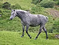 The gray gene (G) is an autosomal dominant gene.[1] In simple terms, a horse which has even one copy of the gray allele, regardless of other coat color genes present, will always become gray. This also means that all gray horses must have at least one gray parent. If a gray horse is homozygous (GG), meaning that it has a gray allele from both parents, it will always produce gray offspring no matter the color genetics of the other parent. However, if a gray horse is heterozygous (Gg), meaning it inherits one copy of the recessive gene (g), that animal may produce offspring who are not gray, depending on the genetics of the other parent and Mendelian inheritance principles. Genetic testing is now possible to determine whether a horse is homozygous or heterozygous for gray.[9] The gray gene does not affect skin or eye color, so grays typically have dark skin and eyes, as opposed to the unpigmented pink skin of white horses.[1]