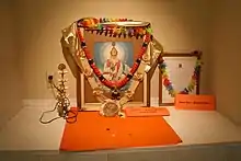 Iconography of Jhulelal varies widely.[1][5] Sindhi Hindus worship Jhulelal at the Shrine at Odero Lal in Pakistan's Sindh province, which is jointly used by sindhi hindus, and Sindhi Muslims who revere the shrine as the tomb of Sheikh Tahir. A second shrine named Jhulelal Tirthdham exists in India at Narayan Sarovar, Kutch, Gujarat.[6]