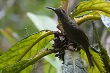 The dark-eared myza is found in forests at elevations from 900 metres (3,000 ft) up to 1,800 metres (5,900 ft) in the north of the island and up to 2,500 metres (8,200 ft) in the south.[5] It feeds from flowers and is described as darting rapidly from one inflorescence to another in its quest for nectar.[6]