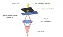 - The scattered light enters the objective lens, while the directly transmitted light simply misses the lens and is not collected due to a direct-illumination block (see figure).