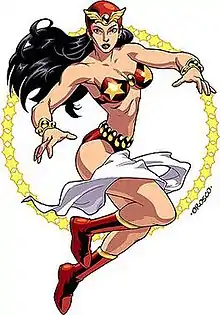 Darna (Tagalog pronunciation: [ˈdaɾnɐ]) is a Filipina superheroine created by writer Mars Ravelo and artist Nestor Redondo. The character's first appearance was in Pilipino Komiks (Ace Publications, Inc.) #77 on May 13, 1950.[2] Darna is a retooling of Ravelo's earlier character, Varga, whose stories he wrote and illustrated himself. This character first appeared in Bulaklak Magazine, Volume 4, #17 on July 23, 1947. Ravelo left the Bulaklak Magazine publications due to differences with the publication's editors.[3] One of the most popular Filipino superheroes, Darna has appeared in many films and several television series through the decades which have far overshadowed her actual comics tenure.