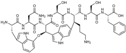 Darobactin is a RiPP, that is, a ribosomally synthesized and post-translationally modified peptide. Its production and export is encoded by a typically silent five gene operon that showed minimal production under laboratory culture conditions. Mature darobactin consists of a seven amino acids core peptide derived from a longer precursor, with unusual Trp-1 to Trp-3 and Trp-3 to Lys-5 (or Arg-5, in variant forms) crosslinks. [2] The key enzyme for maturation from the precursor to the mature form is the radical SAM/SPASM enzyme DarE.