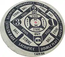 Most boards consist of a four-base diamond: first, second, third, and home plate. Additional areas are marked as strike, out, ball, error, sacrifice, double play, triple play and hit-by-pitch. The home run tends to be in the very center of the board. The diamond is surrounded by a six-inch foul line border. The entire playing field is 42 inches squared including foul territory.[4]