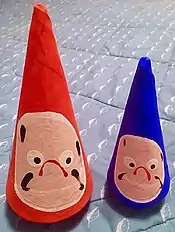 Darumas are still usually made of papier-mâché, have a round shape, are hollow and weighted at the bottom so that they will always return to an upright position when tilted over. In Japanese, a roly-poly toy is called okiagari, meaning to get up (oki) and arise (agari). This characteristic has come to symbolize the ability to have success, overcome adversity, and recover from misfortune.[6] In Japanese popular culture on cards, banners and books, Daruma is often illustrated alongside the phrase "Nanakorobi Yaoki" (七転八起), translated to mean "seven times down, eight times up". While some traditional Daruma dolls have flat bases, the Sankaku or Triangle Daruma (三角だるま) is constructed from a rolled cardboard cone attached to a rounded clay base so that it always stands straight when tilted.[9]