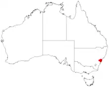 Although there are herbarium specimens of this species from further afield, all the present populations occur in the urban areas of Sydney between Maroota and North Ryde. It grows in heath on sandstone ridge tops or in woodland where the sandstone intergrades with shale. Ninety of the 240 known sites where the species occurs are in national parks or other reserves but the remainder are in habitats often favoured for residential development.[2][3][4]