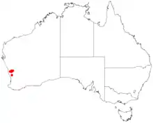 This darwinia is only known to occur in a small area near Coorow where it grows around salt lakes in woodland or shrubland.[3]
