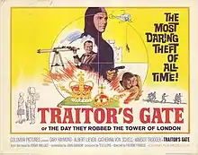 Traitor's Gate (German: Das Verrätertor) is a 1964 West German-British co-production of a black-and-white crime film directed by Freddie Francis and starring Albert Lieven, Gary Raymond, Catherine Schell and Klaus Kinski.[1] It was made by Rialto Film using Hammer Films' Freddie Francis and screenwriter Jimmy Sangster updating the 1927 novel The Traitor's Gate by Edgar Wallace to the mid-1960s. The film features a group of criminals planning to steal the Crown Jewels of the United Kingdom from the Tower of London. It was shot at Twickenham Studios and on location around London. The film's sets were designed by the art director Tony Inglis.