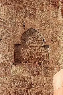 On the east wall of the fortress keep is an Arabic dedicatory inscription of 1174, written in Kufic script attributing the structure to Sultan ibn Mahmud (Shahanshah), one of the Shaddadid Princes that ruled in Ani. It reads the following passage: