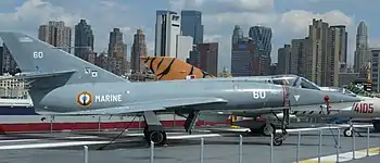 However, this lack of demand did not curtail Dassault's ambitions. Early on, the company had decided to embark on the development of a larger and more powerful variant, which was originally designated as the Mystère XXIV, as a private venture in parallel to the issued specifications.[1][2] The French Navy showed open interest in this prospective Mystère XXIV variant. Bolstered by this, Dassault proceeded with the construction of a single navalised prototype, features of which included new navigation and radar systems, folding wings, deck landing hooks, along with the reinforcement of the fuselage.[1] Following a series of ground tests, its maiden flight occurred on 24 July 1956.[3]