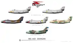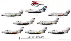 The Dassault M.D.450 Ouragan (French: Hurricane) is a French fighter-bomber developed and produced by Dassault Aviation. It has its origins in a private venture by Dassault to produce an all-French aircraft which would make use of jet propulsion, which subsequently would receive orders from the French Air Force.