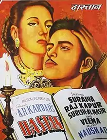Dastan a 1950 Bollywood drama film produced and directed by A. R. Kardar. A box office success, the film became the third highest earning film of 1950, earning an approximate gross of Rs. 1,15,00,000 and net of Rs. 65,00,000 .[1] It stars Raj Kapoor, Suraiya, Veena, Suresh, Al Nasir, Murad and Shakila.[2]
