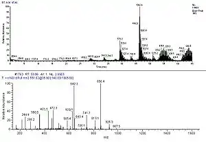 Often, the ionization process is sufficiently violent to leave the resulting ions with sufficient internal energy to fragment within the mass spectrometer. If the product ions persist in their non-equilibrium state for a moderate amount of time before auto-dissociation this process is called metastable fragmentation.[12] Nozzle-skimmer fragmentation refers to the purposeful induction of in-source fragmentation by increasing the nozzle-skimmer potential on usually electrospray based instruments. Although in-source fragmentation allows for fragmentation analysis, it is not technically tandem mass spectrometry unless metastable ions are mass analyzed or selected before auto-dissociation and a second stage of analysis is performed on the resulting fragments. In-source fragmentation can be used in lieu of tandem mass spectrometry through the utilization of Enhanced in-Source Fragmentation Annotation (EISA) technology which generates fragmentation that directly matches tandem mass spectrometry data.[13] Fragments observed by EISA have higher signal intensity than traditional fragments which suffer losses in the collision cells of tandem mass spectrometers.[14] EISA enables fragmentation data acquisition on MS1 mass analyzers such as time-of-flight and single quadrupole instruments. In-source fragmentation is often used in addition to tandem mass spectrometry (with post-source fragmentation) to allow for two steps of fragmentation in a pseudo MS3-type of experiment.[15]