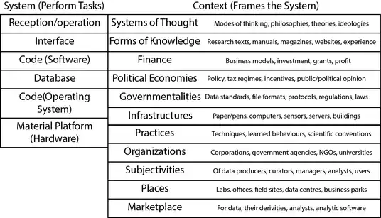 Within the broad landscape of a data ecosystem are numerous data assemblages. An assemblage is described as interconnected socio-technical systems that work in tandem with one another for a common purpose.[3] These systems encompass the technological, political, financial and best practices that sustain the collection, transfer, and dispersion of data.[8] The below table demonstrates the common elements of a data assemblage which facilitate and govern datafication.