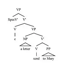 The correct ordering of the oblique dative surfaces through head to head movement. See Figure 2. The verb [send], which moves to the empty V position, has two thematic roles that are assigned to the internal arguments theme: [a letter] and goal [to Mary].[6]: 340 The movement leaves a trace at the original V and creates a sequence of co-indexed V positions.[6]: 343 Raising is attributed to case and Inflectional Agreement.[6]: 343