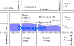 Davenport is a neighbourhood northwest of downtown in Toronto, Ontario, Canada. It is north of the Canadian Pacific Railway tracks and Dupont Avenue and south of Davenport Road and the ridge that is the former Lake Iroquois coastline. Its eastern boundary is Bathurst Street and it stretches west to Lansdowne Avenue. It is contained within the larger city-recognized neighbourhood of Corso Italia-Davenport.