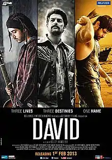 David is a 2013 Indian Hindi-language crime film directed by Bejoy Nambiar, starring Neil Nitin Mukesh, Vikram, and Vinay Virmani in the title role, alongside Tabu, Monica Dogra, Lara Dutta and Isha Sharvani. The film was partially reshot in Tamil under the same title with Jiiva replacing Virmani.[2] The plot revolves around the lives of three different men named David, who are about to take a step which is going to change their lives forever.[3] Both the Hindi and Tamil versions were released on 1 February 2013.