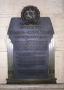 Marcus' grave is the only one in the West Point Cemetery at the United States Military Academy for an American killed fighting under the flag of another country;[2] he was still eligible for interment there because he was a graduate of the academy who served honorably. His paratrooper helmet and Walther Model 9 pistol are displayed at the West Point museum. His gravestone at West Point reads: