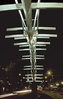 More than 40 major sculptures, most the result of winning open competitions, are installed throughout the US, as well as in Germany, Japan and Canada.[6] Black describes his work as “proto-architecture,” a reference to his fusion of archetypal architectural motifs, such as columns, pillars, arches, and the use of light with the energy and references of sculpture. His community landmarks engage their environments and the viewer spatially, as well as culturally, strongly connecting with the viewer as they move through and around the work.[7]