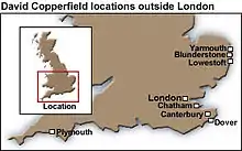 On 7 January 1849, Dickens visited Norwich and Yarmouth in Norfolk, with two close friends, John Leech (1817–1864) and Mark Lemon (1809–1870).[26] Leech was an illustrator at Punch, a satirical magazine, and the first illustrator for A Christmas Carol by Dickens in 1843. Lemon was a founding editor of Punch, and soon a contributor to Household Words, the weekly magazine Dickens was starting up; he co-authored Mr Nightingale's Diary, a farce, with Dickens in 1851.[27][28] The two towns, especially the second, became important in the novel, and Dickens informed Forster that Yarmouth seemed to him to be "the strangest place in the world" and that he would "certainly try my hand at it".[29] During a walk in the vicinity of Yarmouth, Dickens noticed a sign indicating the small locality of Blunderston, which became in his novel the village of "Blunderstone" where David is born and spends his childhood.[15]