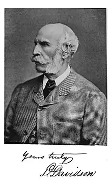 Davidson was born in Haddington where his father Henry M. Davidson was county Sheriff Clerk. He went to the local school and studied French from John Johnstone. His childhood friends included Jane Welsh Carlyle. In 1827 he moved to India to serve in the Bengal Native Infantry under the East India Company and retired in 1848 with the rank of Major. While stationed in Asirgarh Fort in 1832, he had a telescopic sight attached to a single-barrel rifle made by Samuel Staudenmeyer. The next year he wrote to the Bombay Sporting Magazine on his experiments with elongated rifle bullets with a fluted centre which he claimed increased their range and stability. He also developed a "air-cane" a walking cane with a rifle barrel and a compressed air system in the handgrip that allowed shooting a ball. He used it to kill snakes, fish and birds while on walks. He served in western India where he was a shooting companion of James Outram. He served with Edward Goldsmid and (later Sir) George Wingate on the revenue surveys[1] in the Deccan region. As part of this he introduced the use of graphs to depict revenue statistics (then supposedly novel).[2] He retired in 1848 and settled in Edinburgh where he built a mansion Woodcroft with the motto at the entrance Meliora semper cogita (lit. "Always think better") copied according to Jane Carlyle from a home in Haddington. He was later made an honorary colonel of the Queen's Edinburgh Rifle Volunteer Brigade. He took an interest in theology, literature and poetry. Here he also began to develop his telescoping rifle sight system working along with gunmaker John Dickson & Sons and the optics firm Alexander Adie & Sons both on Princess Street. He corresponded with Professor Charles Piazzi Smyth on this work and the idea was read in a paper to the British Association in 1850. Some of these guns were demonstrated at the Great Exhibition of 1851. In 1855 he patented a "detached collimator" and an "improved apparatus for point ordnance and restoring the aim of the piece either by day or night when it is once obtained". In 1897 he was knighted by Queen Victoria.[3][4]