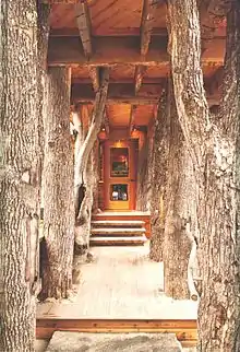 In one of his designs, the Tree House, about one-third of the vertical supports are trees that were originally located on the property. The strength is preserved because they are in full shape without any cuts, usually without stain or bark removal.[16]