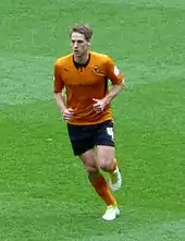 The midfielder became a regular in the team after promotion, and contributed the winning goal against Fulham in the first home win of the season on 20 September 2009.[25] He suffered ankle ligament damage that December which kept him out for four months,[26] but he recovered to make five appearances in the closing months as the club retained their top-flight status.[27] Edwards' contribution to Wolves in the 2010–11 season was severely hampered by injuries. He signed a new three-year contract with the club, including an option of a one-year extension,[28] and made 12 appearances, scoring once in a 2–1 victory at home to Manchester City,[29] where he scored past his former Shrewsbury teammate, and lodger, Joe Hart.[30]