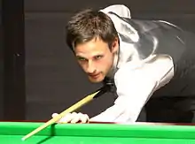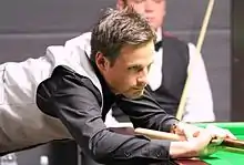 Gilbert was eliminated in the qualifying rounds of the opening two ranking events of the season.[27] At the minor-ranking Ruhr Open he won four matches to play in the quarter-finals where he beat Barry Hawkins 4–2, before losing 4–3 to Tian Pengfei in the semis.[28] Gilbert's form continued later in to the month at the International Championship as he knocked out Xiao Guodong 6–5, Oliver Lines 6–4 and Ryan Day 6–4 to play in the first ranking event quarter-final of his career. He came back from 4–2 down against Marco Fu to edge it 6–5 which included a 130 break and then saw off Thepchaiya Un-Nooh 9–5.[29][30] In the final, Gilbert was level with John Higgins at 4–4, but would lose 9–5. The £65,000 runner-up's cheque is by far the biggest of his career and he moved up to 21st in the world rankings afterwards.[31] Gilbert stated that his newfound form was down to a new cue he acquired from fellow professional Matthew Selt six weeks previously.[29] Gilbert was knocked out in the third round of both the UK Championship and China Open 6–3 to Marco Fu and 5–3 to Higgins respectively.[27] Gilbert won three matches to qualify for the World Championship and faced Ronnie O'Sullivan in the first round. He was defeated 10–7, but said it was the best he had ever played without winning a match.[32] He moved up to world number 22 at the end of the season.[33]